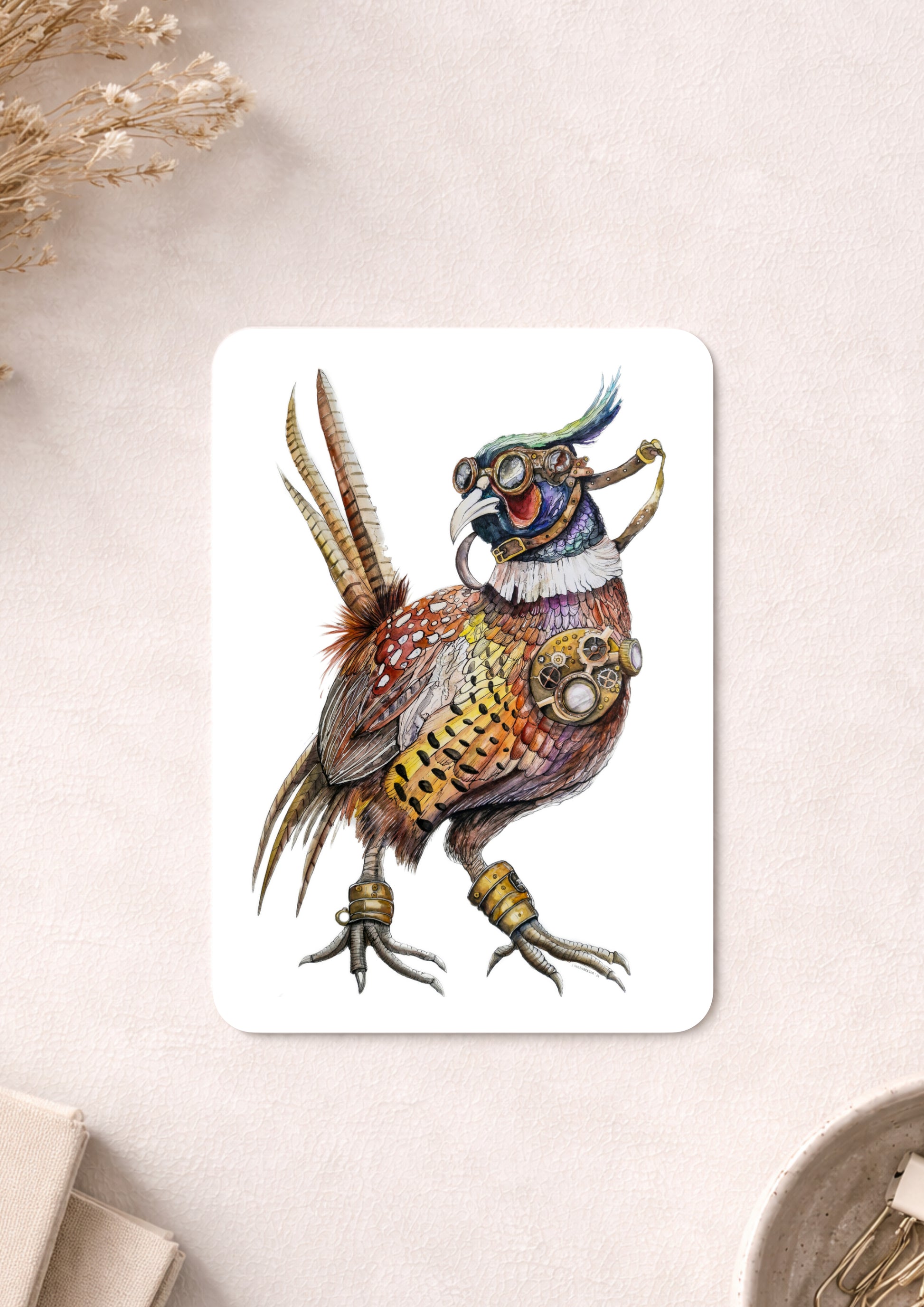 Dieser außergewöhnliche Fasan vereint natürliche Eleganz mit kunstvoll integrierten Steampunk-Elementen. Zwischen schillernden Federn in Ocker, Kupfer, Purpur und warmen Erdtönen blitzen Zahnräder, Messingdetails und mechanische Konstruktionen hervor – als wäre sein Herz ein Uhrwerk.